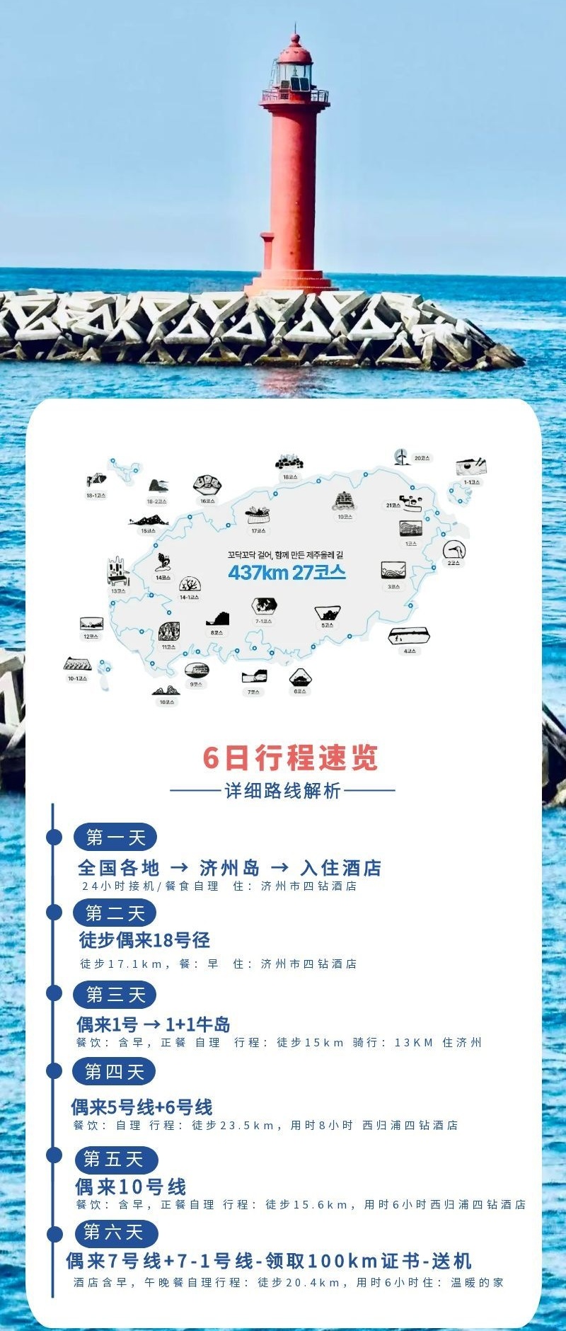 早餐后退房,然后坐车前往18号线起点,开始我们偶来小路100km的徒步,偶来小路18号线总长17.1千米,在此段路线漫步,可以邂逅济州十二美景之一的“沙峰落照”、市民体育公园、坤乙洞、华北防波堤的“诗意灯塔路”、华北环海长城以及深受济州当地居民喜欢的传统休养胜地“三阳黑沙海水浴场”。