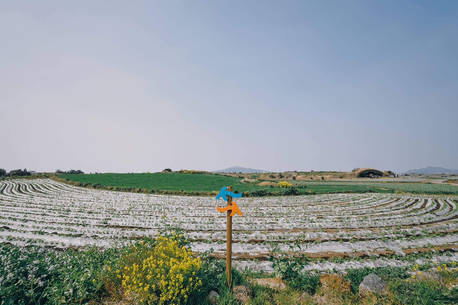 早餐后坐车前往1号线起点,这也是济州偶来最先开始的路线,真正意义上的起点。经过绿油油的田野,登上末尾岳、卵岳,看到城山日出峰、牛岛,一眼望去犹如展开画布的原野和大海。黑色石墙围绕的田地星罗棋布地连在一起的田野,就像用五连六色的布缝好拼贴上的一张方格布一样的美丽。