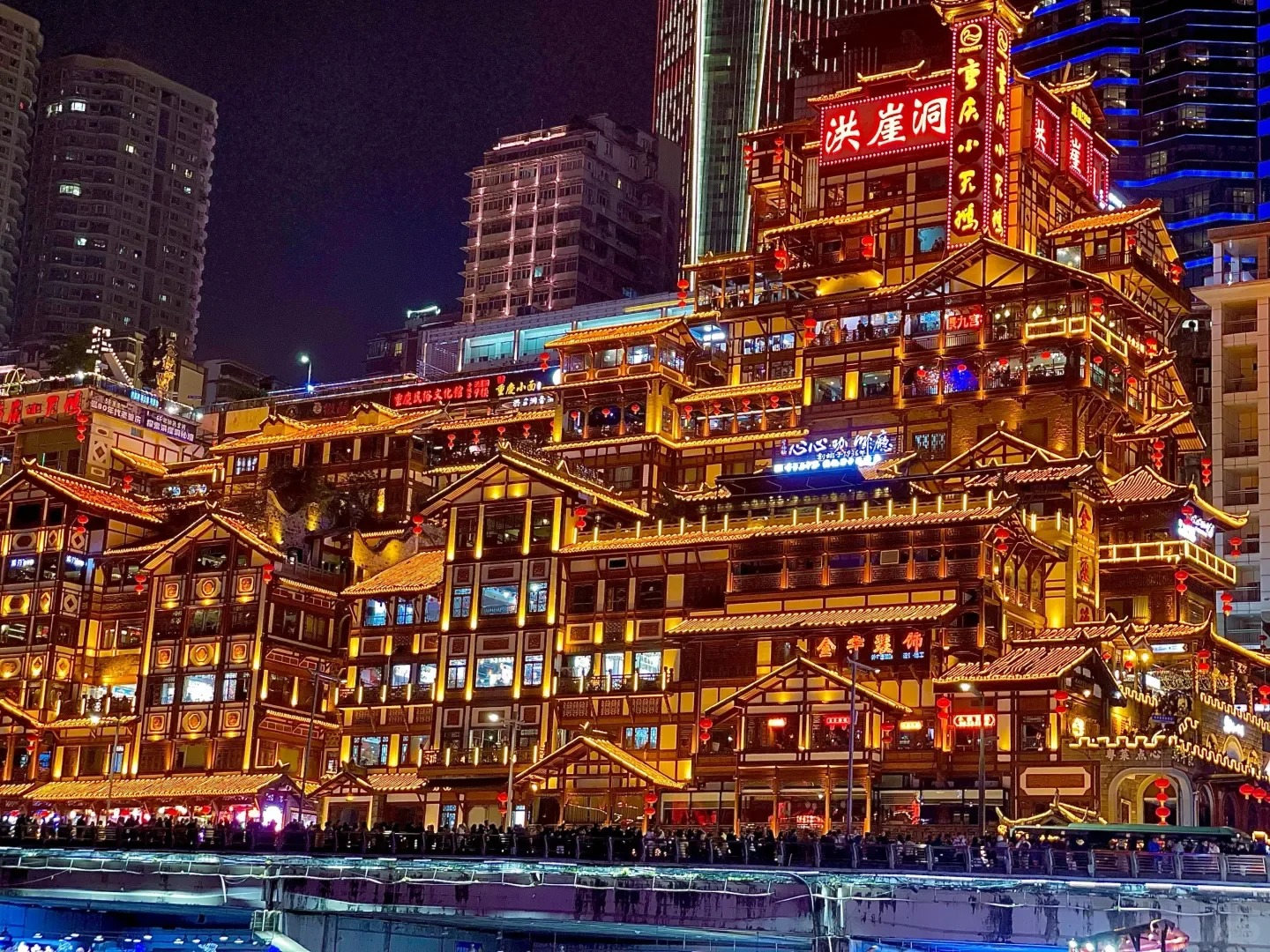 走进【洪崖洞夜景】(游览时间不低于30分钟)夜幕降临,华灯初上,依山而建的吊脚楼,从1楼到11楼,层层叠叠,错落有致,仿佛悬挂在峭壁之上。每一层楼都亮着暖黄色的灯光,将整个建筑勾勒得金碧辉煌,如同童话世界中的城堡。