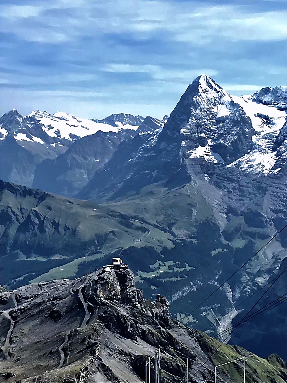 艾格峰是阿尔卑斯山的著名观景平台,可以清晰地欣赏阿尔卑斯山西南的奔宁阿尔卑斯山脉,瓦莱阿尔卑斯山脉的马特洪峰、多姆峰和魏斯峰。攀登艾格峰顶需要经过一段特别的徒步线路。