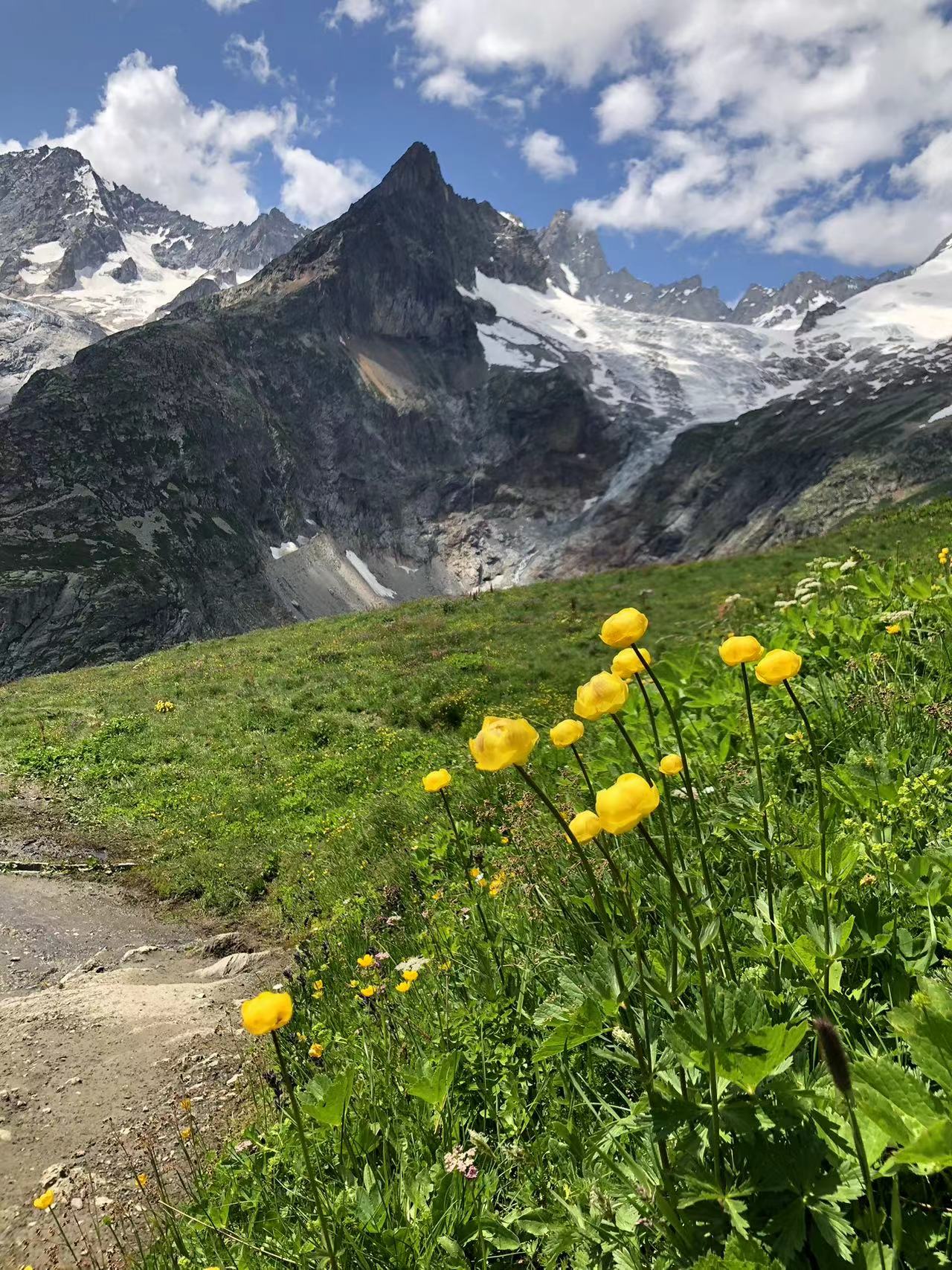 勃朗峰的空间植被分布最为精彩。亚高山一带,云杉和落叶松为主的针叶林,为雪峰系上了墨绿色的腰带。高山草甸铺开地毯,风铃草、红门兰、黄海葵、耧斗菜、堇菜、勿忘草、紫菀……点缀着姹紫嫣红的花斑。