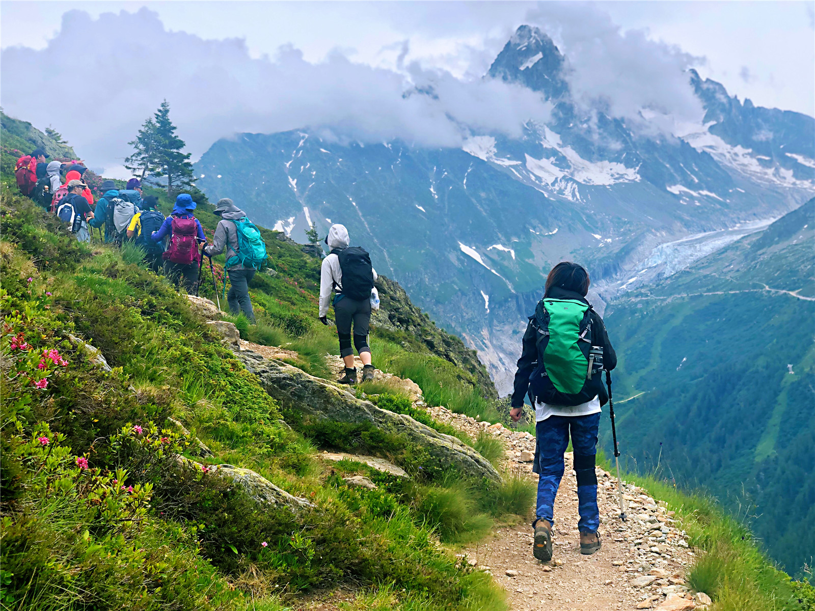 上午9:30,我们在酒店集合,由法国向导介绍完日程后,便从霞慕尼Les Praz的Flégère缆车站出发,开始了环勃朗峰的徒步旅行。首先,我们会乘坐Flégère缆车到达Mont Blanc瞭望台,抵达海拔2300米的Lac Blanc。然后下行至Col des Montets和Aiguilles Rouges自然保护区,再前往Montroc和Tour村,完成第一天的徒步。