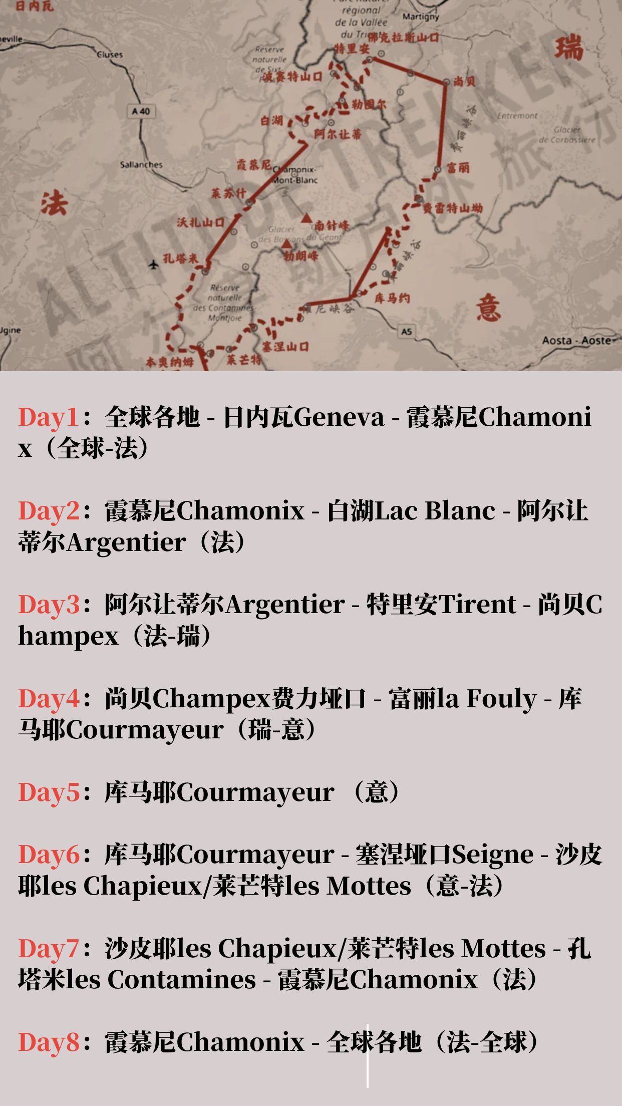 跨越法意瑞三个国家,途径库马耶,一路收获阿尔卑斯著名高峰美景,沿途参观自然保护区,最终完成勃朗峰的整趟穿越,旅行的最后我们还会参观日内瓦,感受瑞士的奢华和宁静.