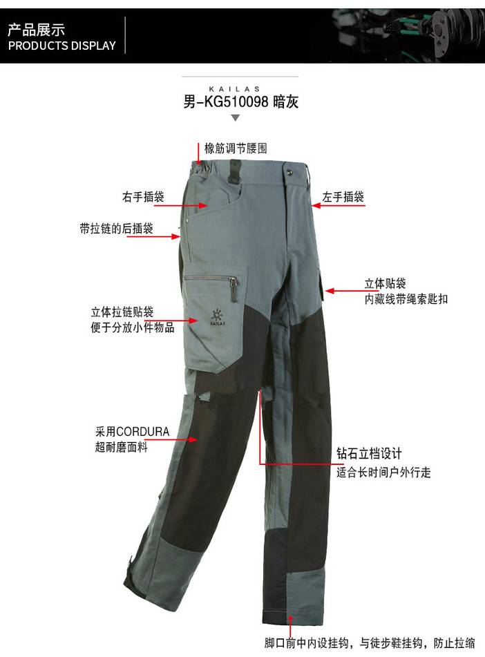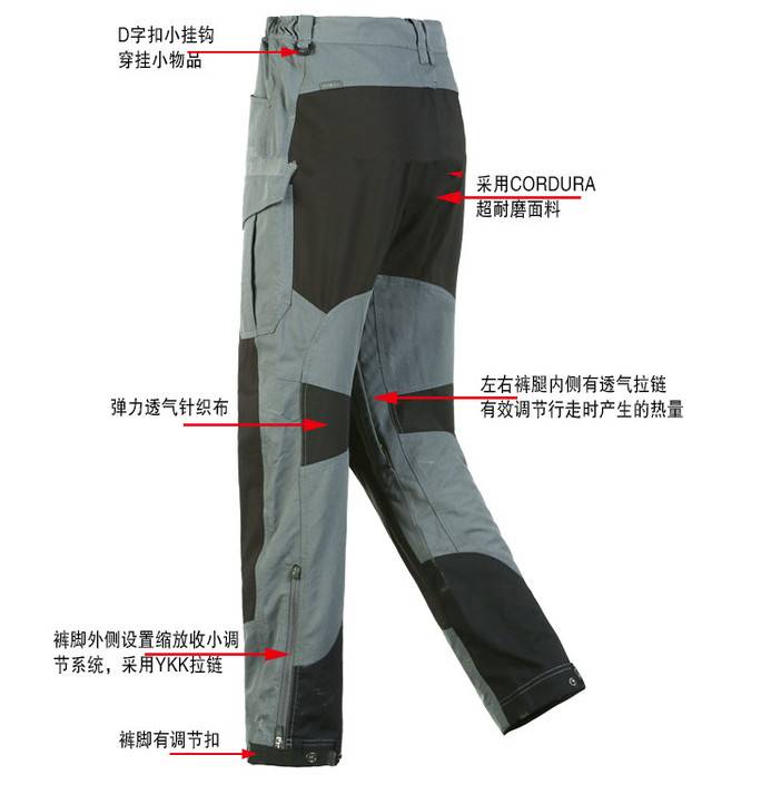 5.各种挂点。腰部D字行小挂钩,方便穿挂小物品;裤脚有挂钩,方便与徒步鞋挂点连接,防止拉缩。