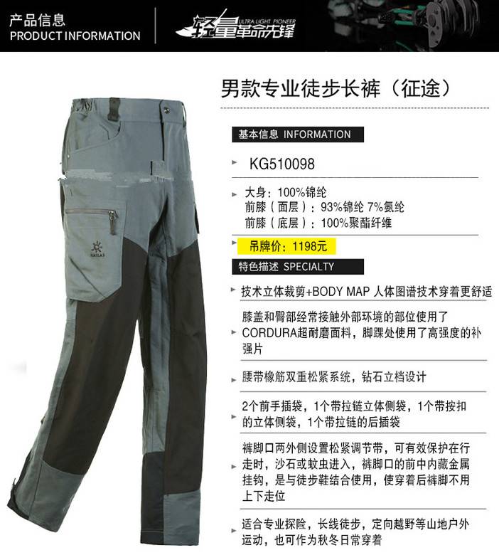 1.裤子完全按照重装徒步裤设计,全裤有5个口袋,位置设置合理,其中侧面口袋内部又进行了更细致的分隔,左侧口袋內藏钥匙扣绑绳。口袋完全满足重装徒步各种随身携带物件的携带需求。