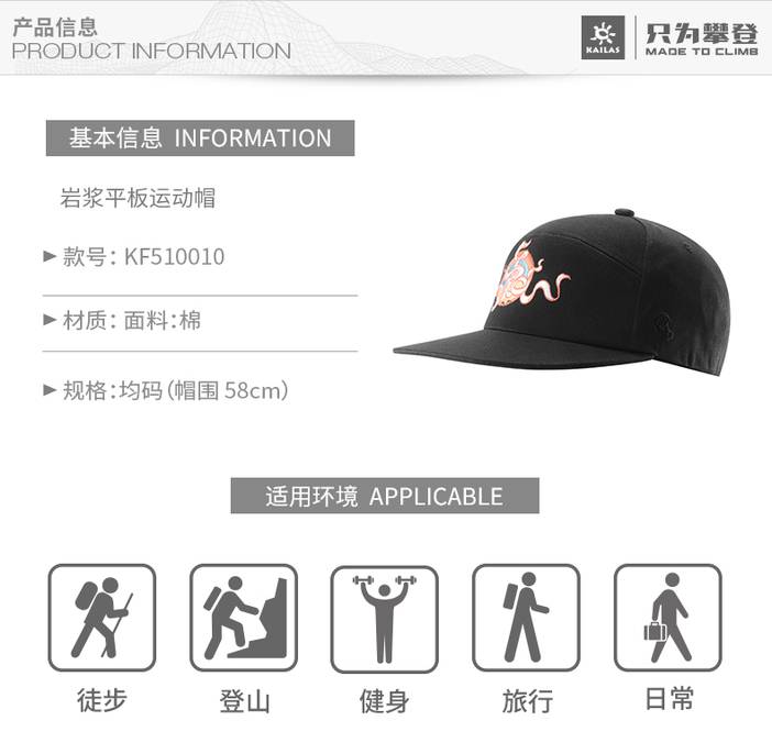 凯乐石户外运动平檐帽男女款纯棉休闲时尚岩浆平板棒球KF510010